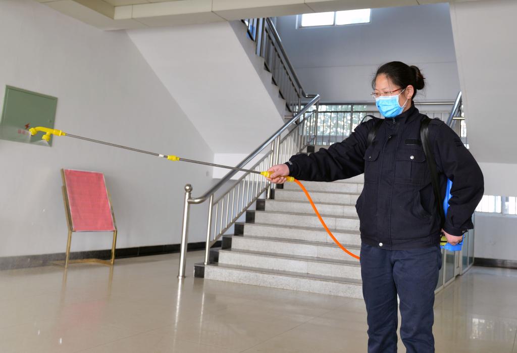 該礦物業(yè)科衛(wèi)生隊(duì)黨員劉洋,背著噴霧器每4小時(shí)一次對(duì)辦公樓走廊、職工宿舍、衛(wèi)生間及所屬崗位進(jìn)行消毒,對(duì)食堂等關(guān)鍵重點(diǎn)場(chǎng)所每日不少于3次消毒。(王亮 陳更)