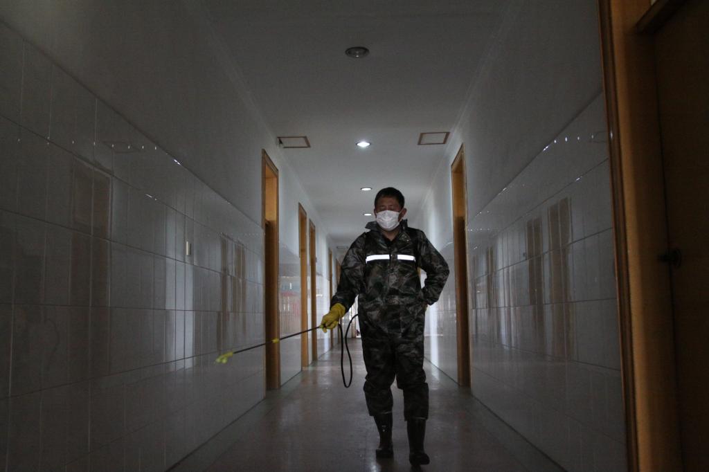 2月4日下午4:30,在皖北康復(fù)醫(yī)院南區(qū)大門口,筆者見到了“全副武裝”的康復(fù)治療中心副主任金濤,來不及多問一句,金濤便帶著消殺物品上了“戰(zhàn)場(chǎng)”。