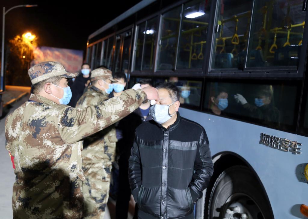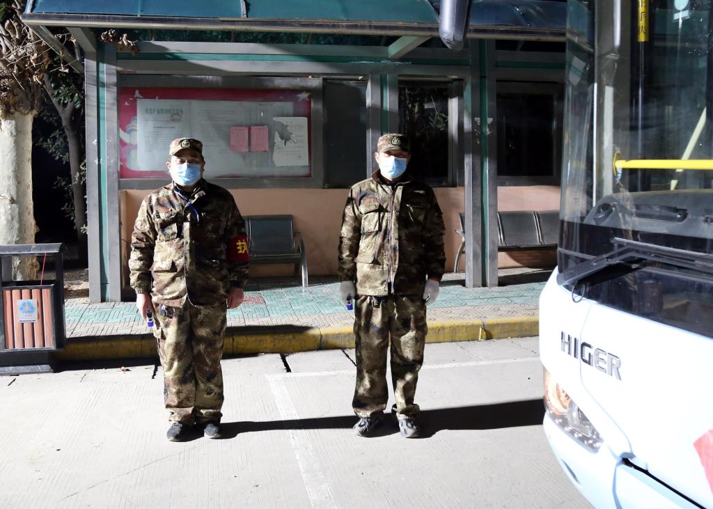 上圖2月2日凌晨5:20,為曹輝(左一)和隊(duì)員在通勤車前,等待為職工測(cè)量體溫