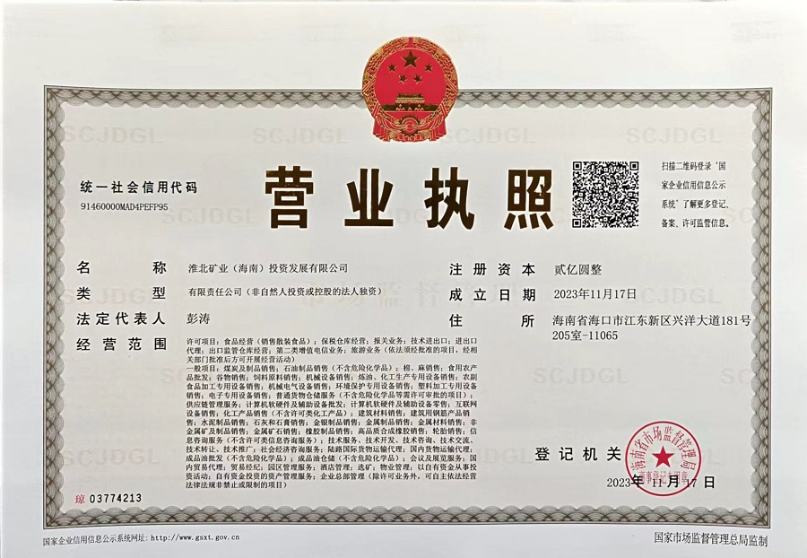 11月17日,淮北礦業(海南)投資發展有限公司(以下簡稱淮礦海南公司)在海南省海口市江東新區注冊成立。該公司為淮北礦業控股股份有限公司投資設立的全資子公司,主要從事國內國際大宗商品貿易、產品加工增值及對外投資等業務。