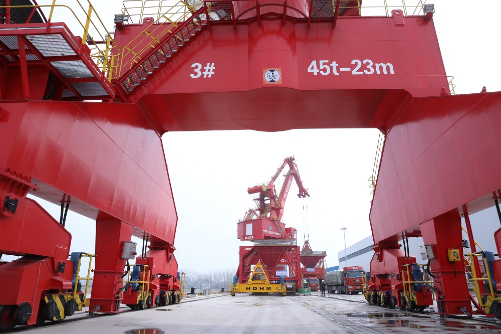 3月26日,記者來到淮北市濉溪縣孫疃港,現場起重機、多用途門機、移動式裝船機屹立在澮河岸邊正在吊運貨物,一派忙碌的景象。