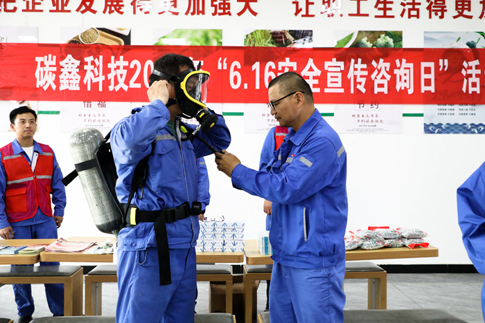 碳鑫科技采取現場教學的模式,對正壓式空氣器的穿戴使用方法進行講解,提高職工安全技能(閆旭 攝)