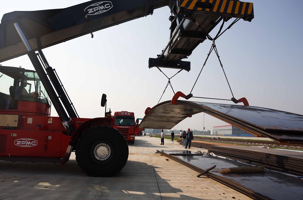 10月11日上午,淮北零碳智慧物流產業園大宗物資作業現場,正面吊運起重機正開足馬力,將600噸16至25毫米厚度的大塊鋼板一次性吊起6至8塊,裝到排成長隊的6軸大貨車上。