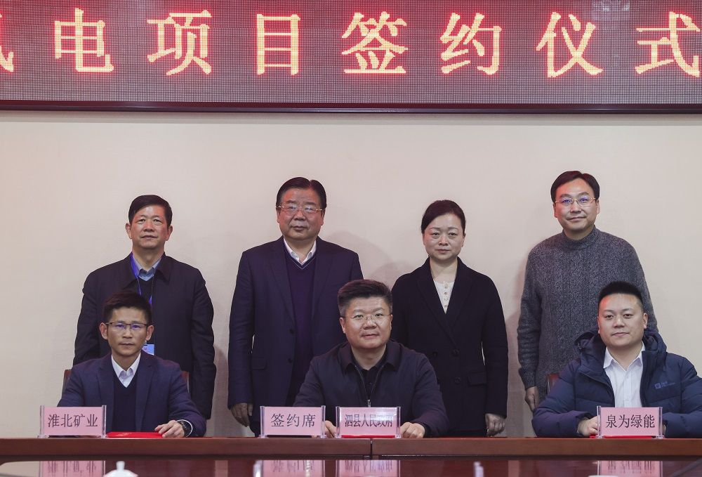 2月14日,淮北礦業集團與泗縣人民政府、泉為綠能投資(海南)有限公司舉行三方簽約儀式,順利簽約300兆瓦泗縣風電項目?;幢钡V業集團黨委副書記、總經理孫方,淮北礦業副總經理陳亞東;泗縣縣委副書記、縣長王汝娜,縣委常委、副縣長王躍明,以及泉為綠能投資(海南)有限公司、上海贏古資產管理公司負責人出席了簽約儀式。