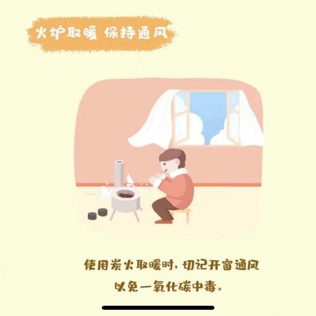 2.注意通風(fēng):室內(nèi)使用煤爐、炭火等取暖設(shè)備時(shí),煤炭要燒盡,不要悶蓋;門窗要預(yù)留一定的縫隙,保持室內(nèi)空氣流通,避免一氧化碳聚積。